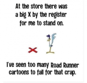 As curmudgeonly as I appear here, I actually do try to brighten the day of my fellow humans. Last week while waiting in line at the checkout, I stepped on, then intentionally side-stepped away from, the red X. I turned to the elderly gentleman behind me in line and said, “I’ve seen Road Runner”.