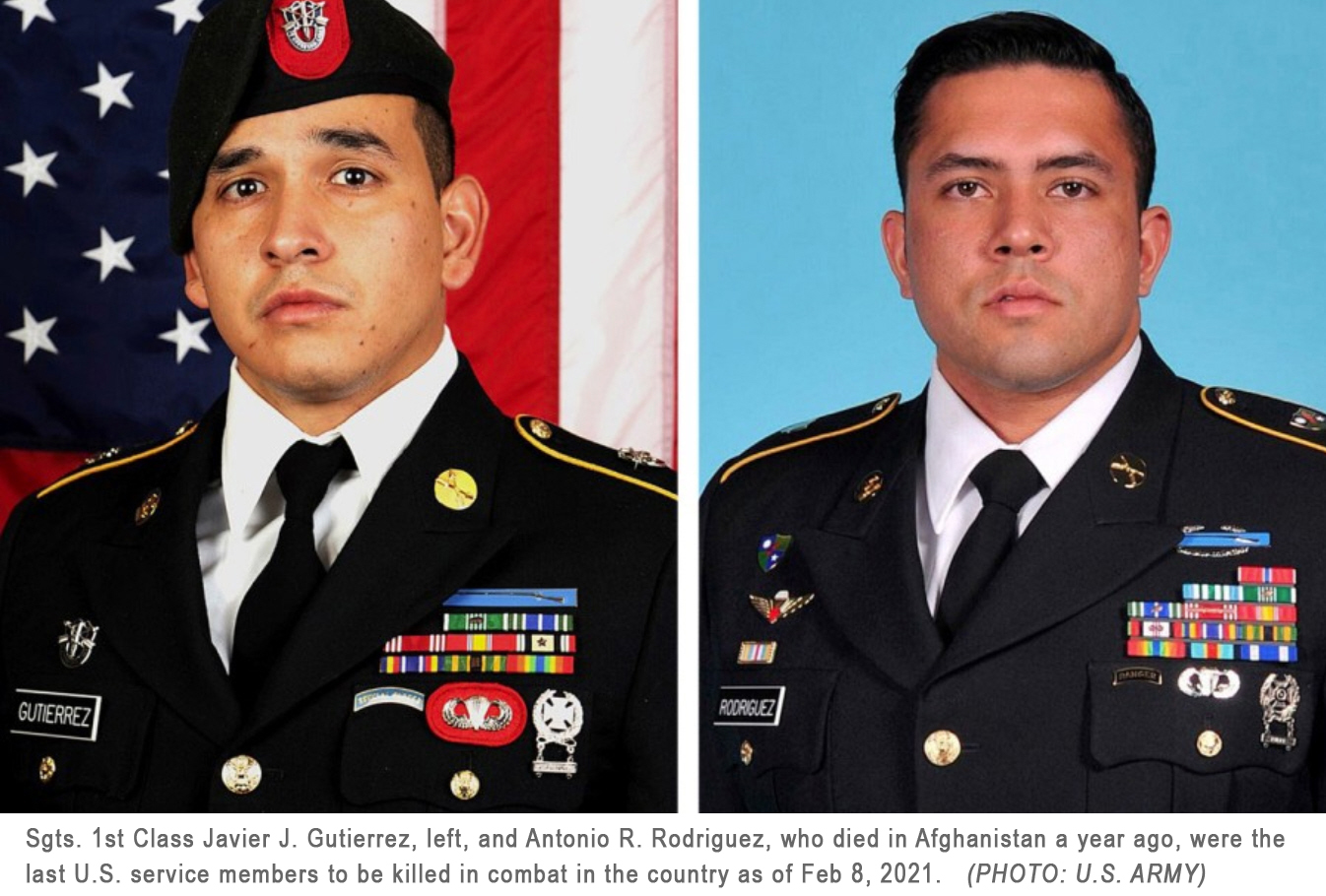 Army Sgts. 1st Class Javier Gutierrez and Antonio Rodriguez were the last Americans to die in battle in Afghanistan on Feb. 8, 2020. Two other service members — Army Staff Sgt. Ian McLaughlin and Army Pfc. Miguel Villalon — were killed in combat there in January last year.
