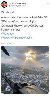 The sunset wasn’t the problem, according to local media reports, but the view included the barrel of a .50-caliber machine gun and the caption: “Oki views! A view down the barrel with HMH-465 ‘Warhorse’ on a recent flight in Okinawa!!” The caption included the hashtags #FightNow and #FreeAndOpenIndoPacific.