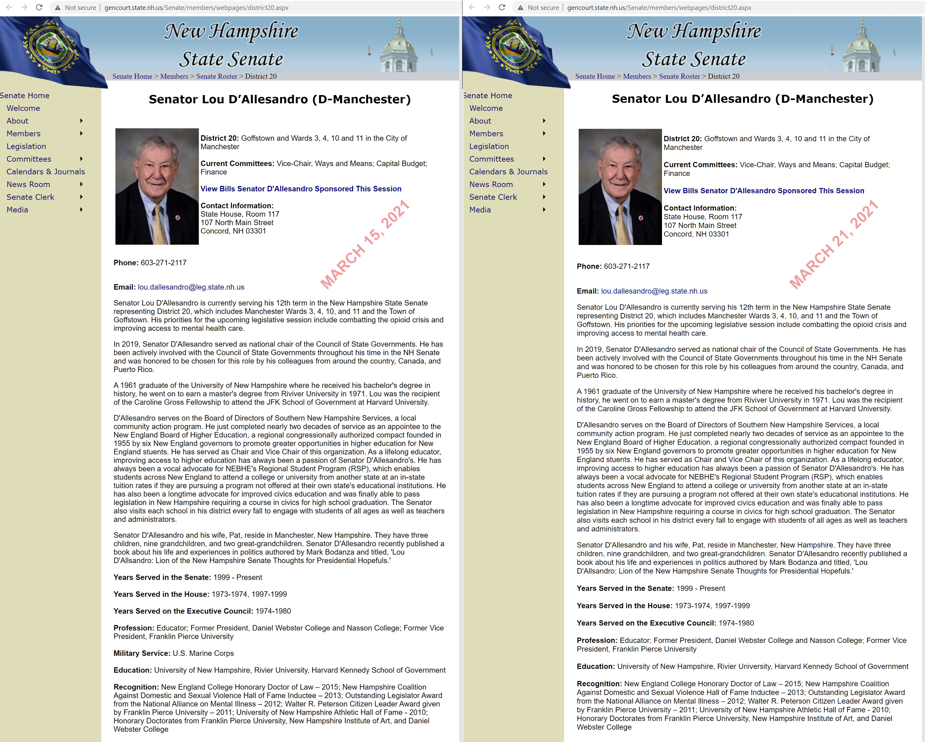 On a bill-tracking page, Senator D’Allesandro’s biography lists him as having retired from the U.S. Marine Corps.NOTE: The above senate page has now been edited and the military service has been removed. It can still be pulled up on Google cache or an internet archive. See comparison here – this edit occurred sometime between March 15 and March 21, 2021.