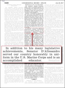 On July 26, 2017, Senator D’Allesandro was officially recognized by a formal submission into the Senate Record. This document is part of the record at the U.S. Congress. In this official record, D’Allesandro was honored for having “served our country honorably in uniform in the U.S. Marine Corps…”
