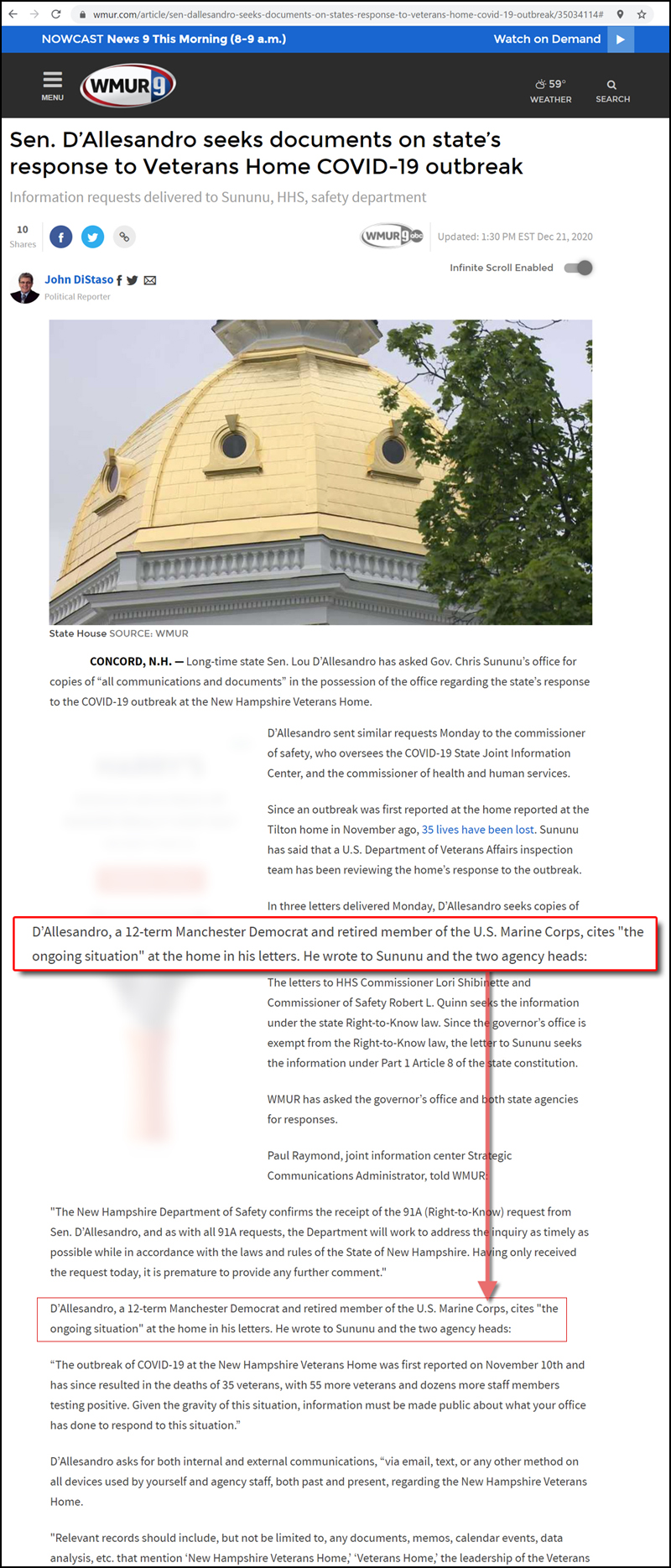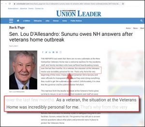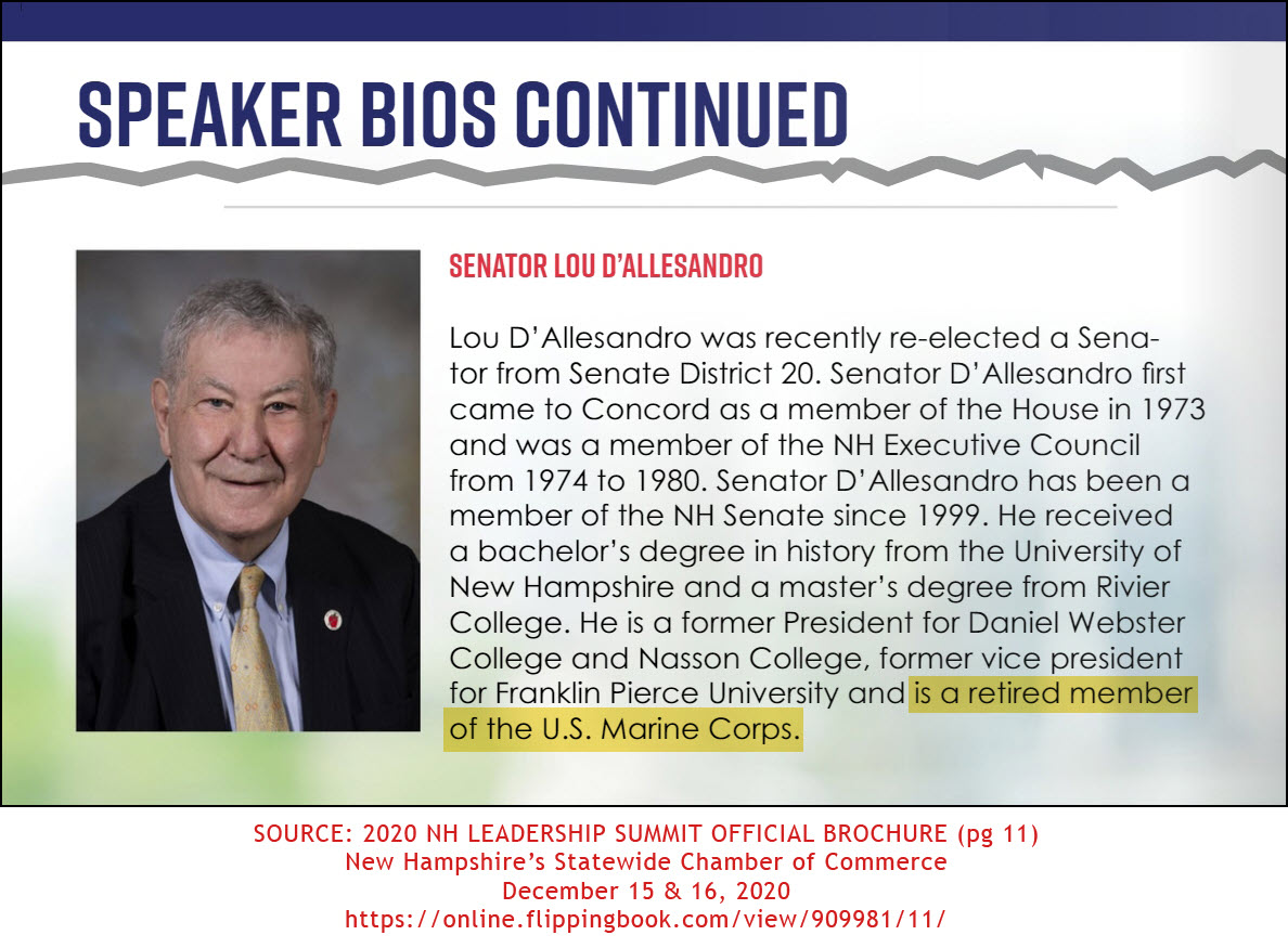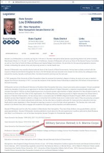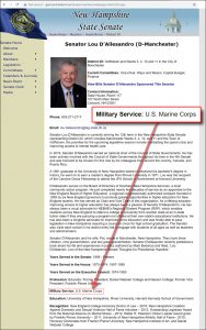 Red flags were raised by Senator D’Allesandro’s constituents about the claims. On Senator D’Allesandro’s official NH Senate page, it states under “Military Service” that he was in the U.S. Marine Corps.