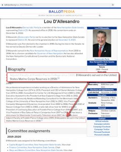 “Throughout the event, speakers such as Sullivan and State Senator Lou D’Allesandro (D-Manchester), himself a retired U.S. Marine, also used statements and actions from President Donald Trump as a contrast to Biden’s actions.”On D’Allesandro’s Wikipedia page, there is a photo of him wearing a United States Marine Corps badge on his lapel…