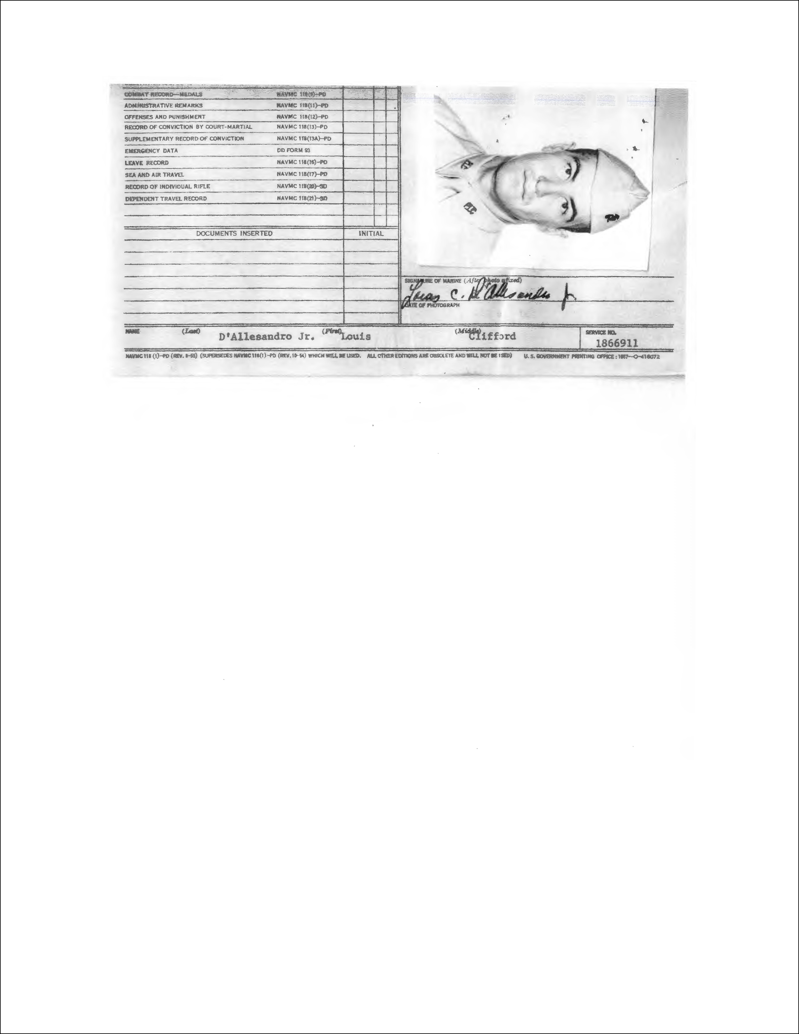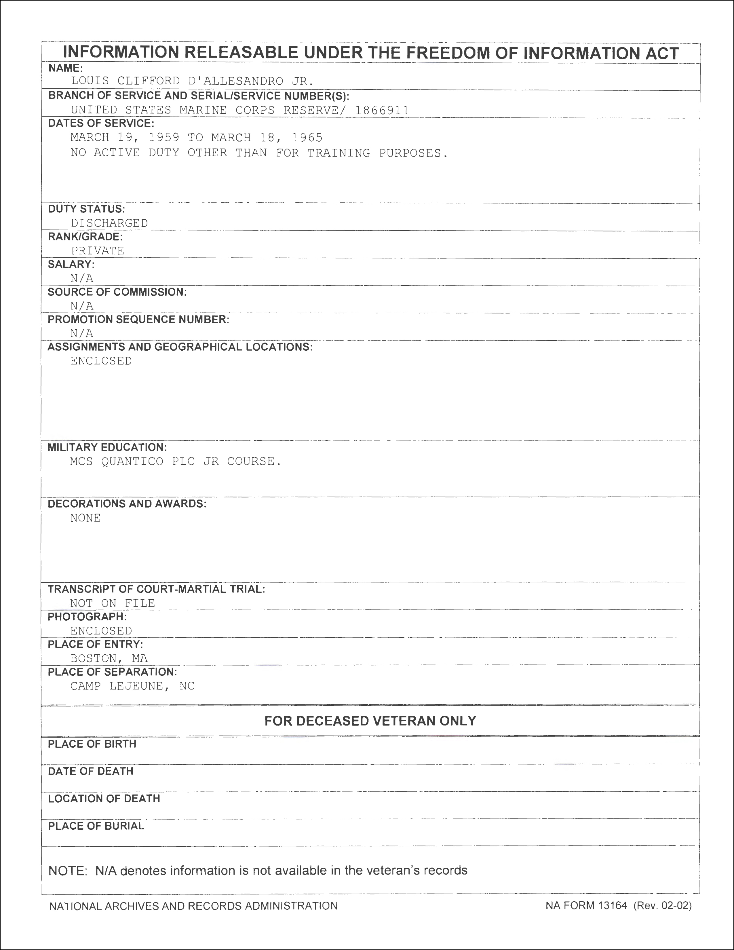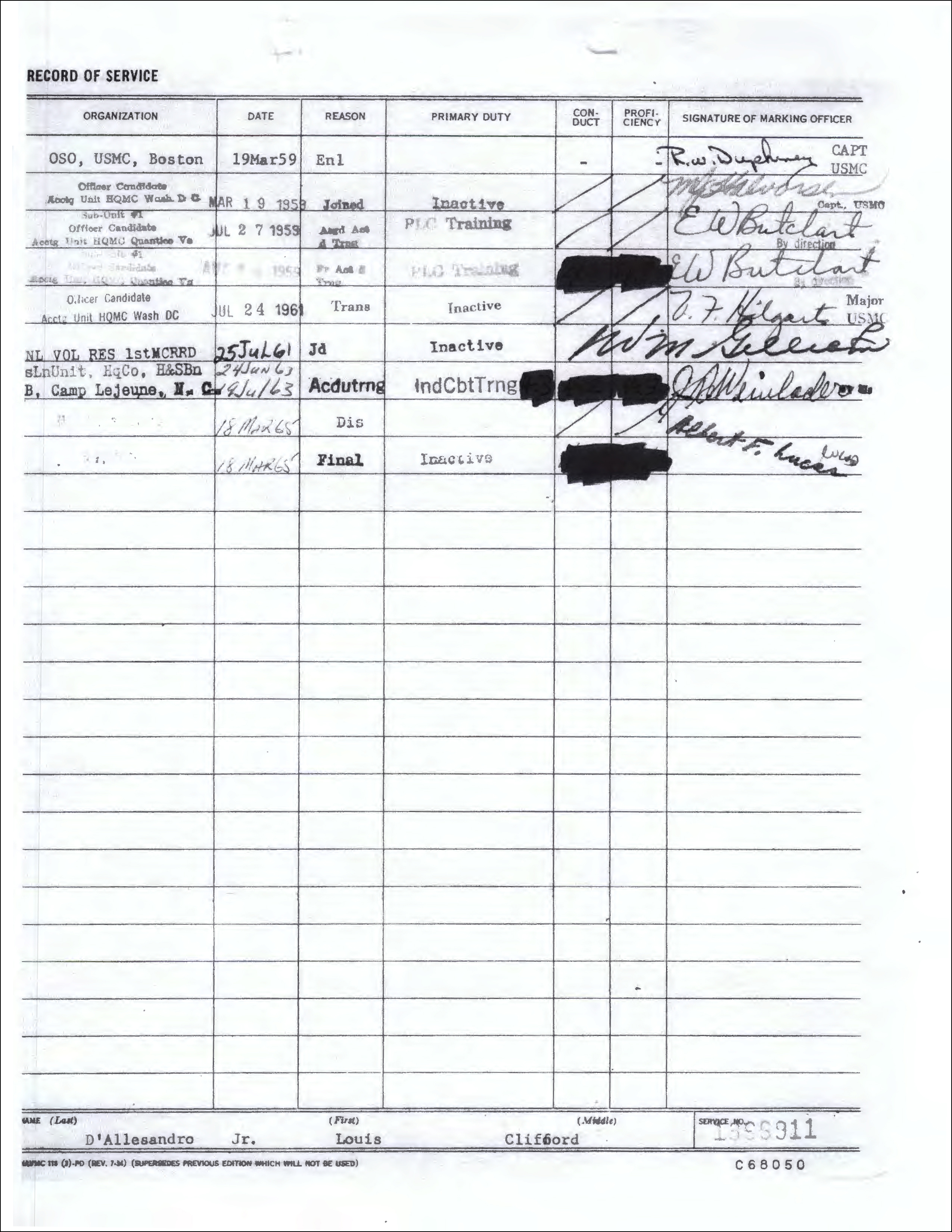 Furthermore, If D’Allesandro had become a Marine Officer there should be an entry in his records that reflects his graduation from The Basic School (TBS) in Quantico.