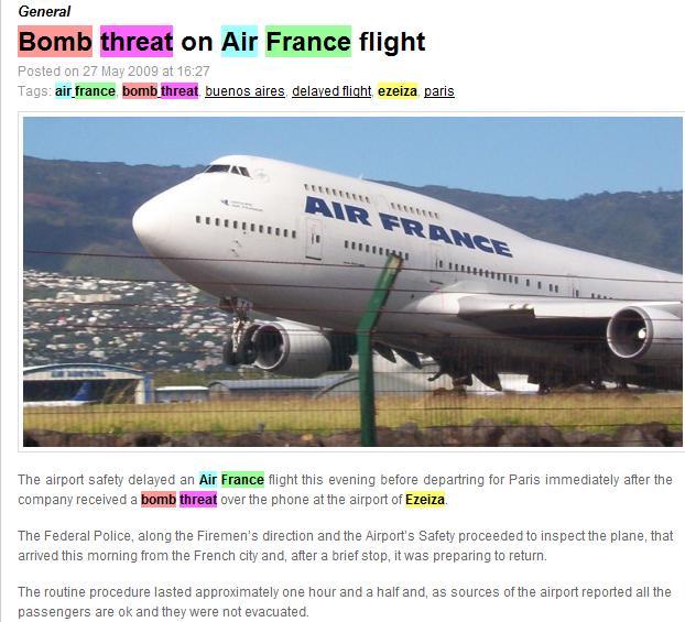 Well, on the day before, an Air France flight from Brazil went down. Drudge throws up a link to an article from last week that reported that an Air France flight was threatened by terrorists. Here’s a screen capture of that article in case it disappears;