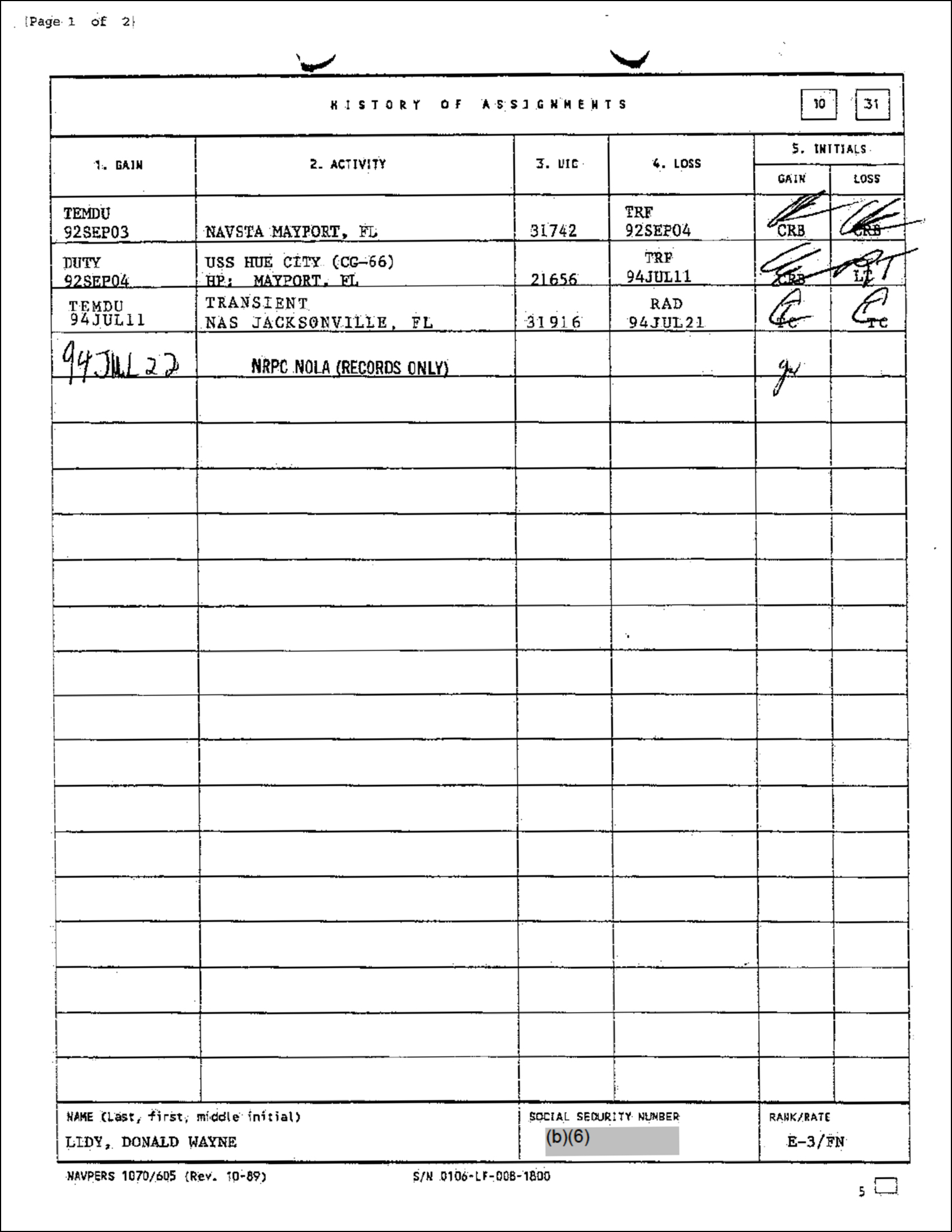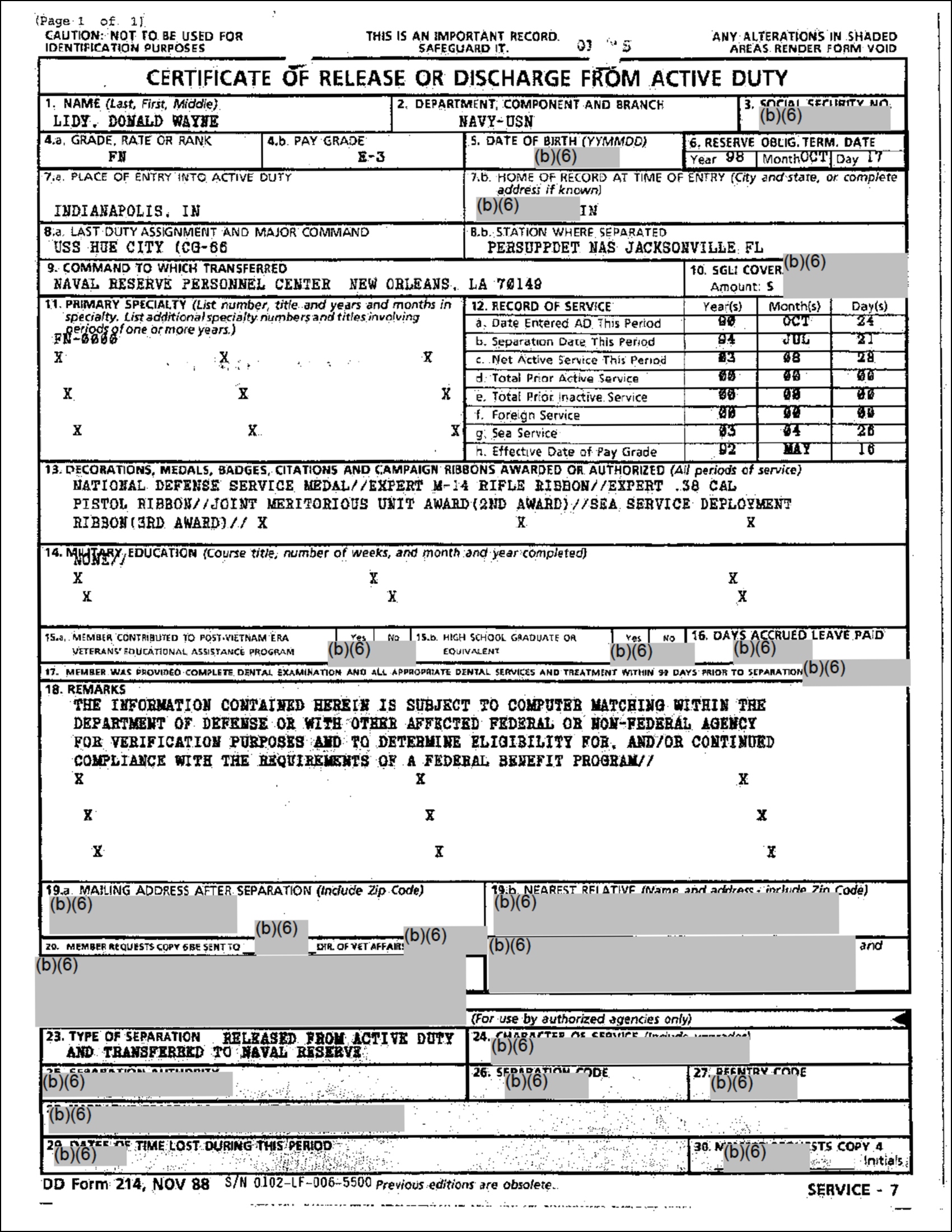 Nor is there any indication that Lidy, based on awards, was in Desert Storm. He only entered the Navy in October of 1990 and after a few months in boot camp, and possible leave right after boot camp, he reported to the USS Paul (FF-1080) on 16 Feb 1991. Since Desert Storm ended on 28 Feb 1991, it represented a very tight window to make such a claim.