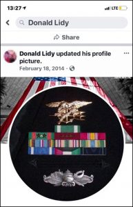 An ex-SEAL that works with Military Phony checked both the UDT/SEAL archives and the UDT/SEAL database and found that there is NO record of “Donald Wayne Lidy” or any other variation of his name ever completing BUD/S Training or assigned to any SEAL teams.