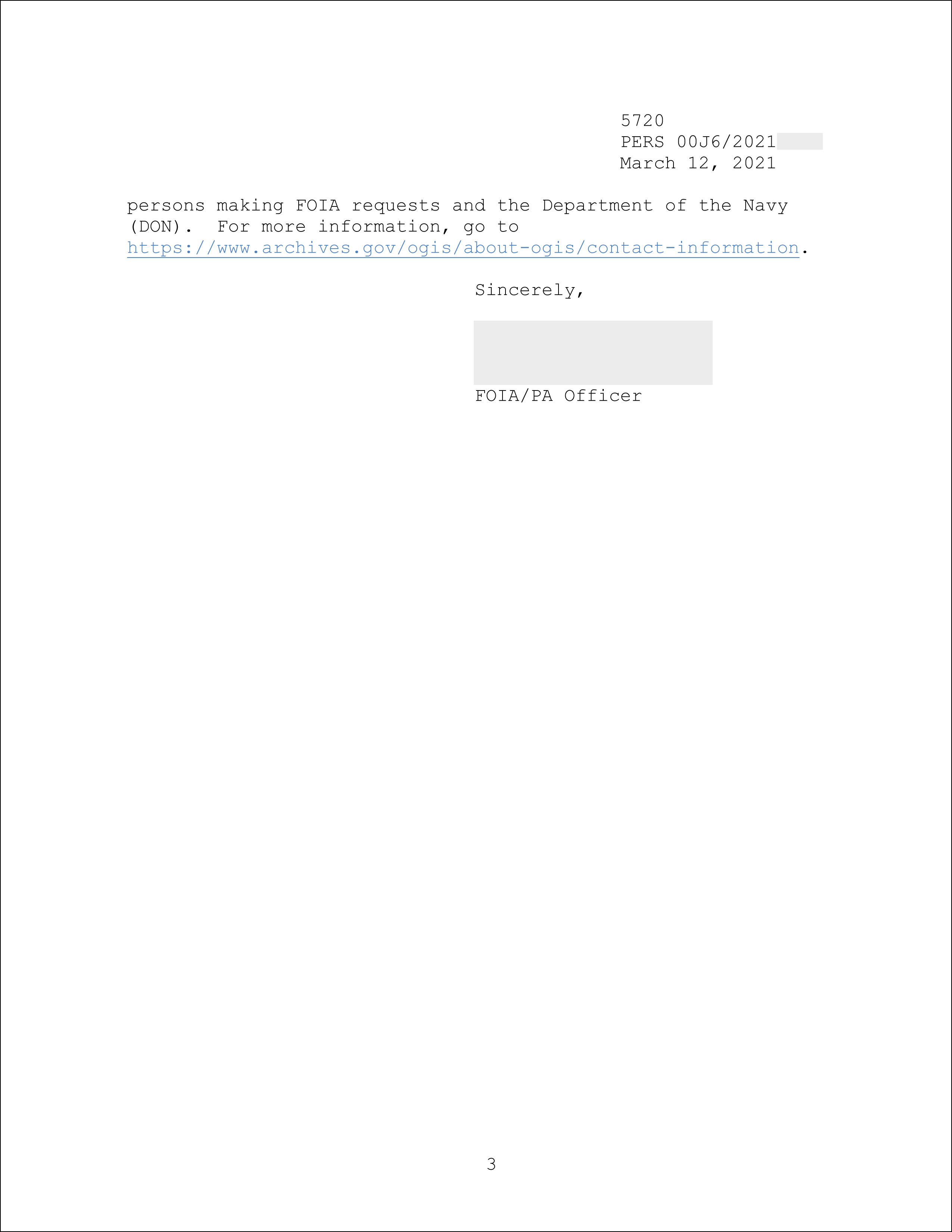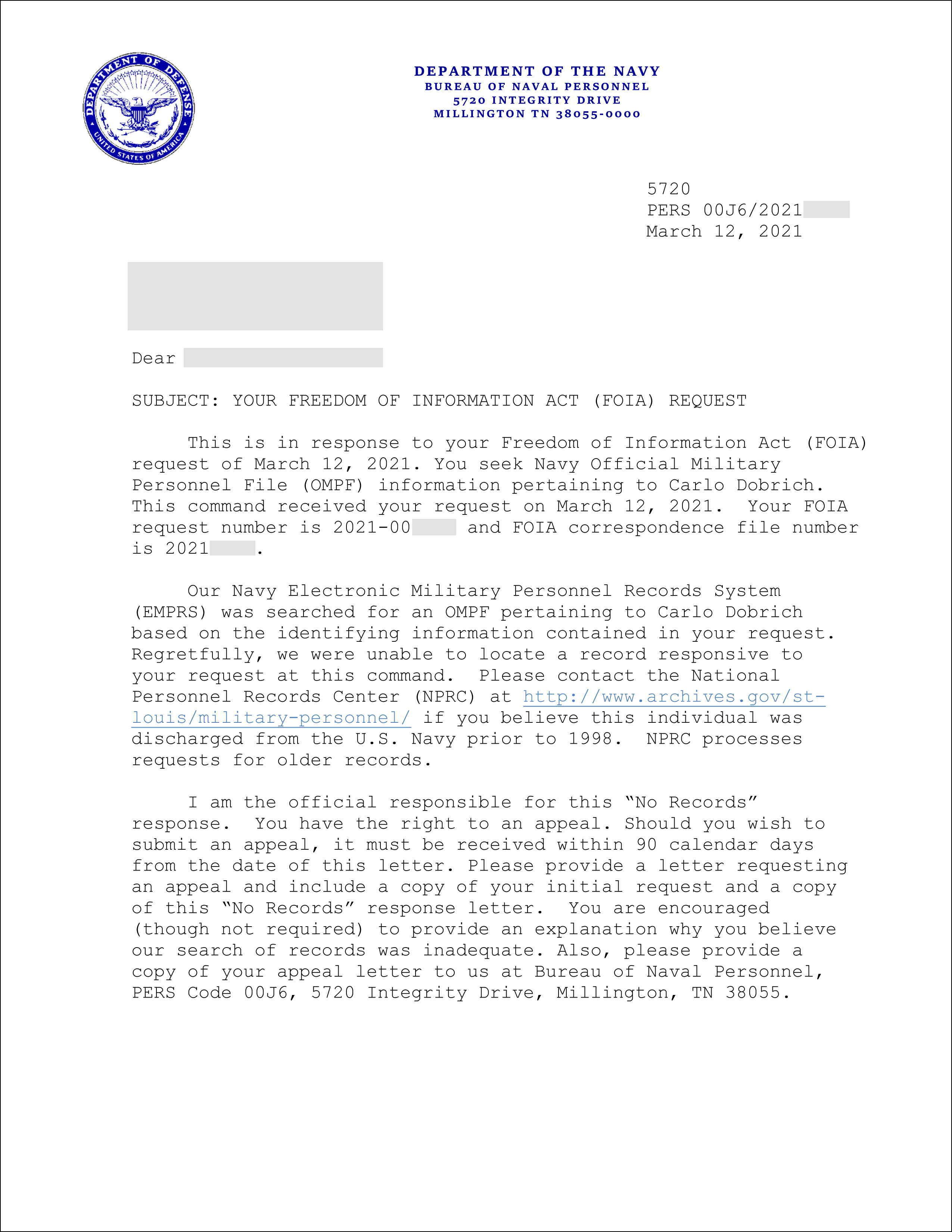 The Department of the Navy responded with the below letter. As somebody around here would often say: “The Navy said ‘Who?'”