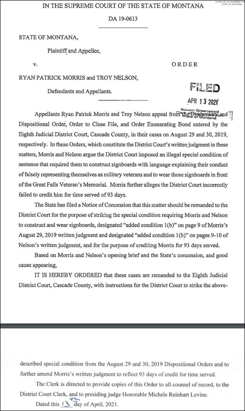GREAT FALLS — Greg Pinski, a former District Court judge in Great Falls, is sharing his reaction to the Montana Supreme Court’s decision to overturn a punishment he ordered for two men who lied about being military veterans..In 2019, Ryan Morris and Troy Nelson lied to Pinski about being veterans in an effort to get lesser sentences for crimes they committed and subsequently be enrolled in Veterans Treatment Court..Pinski ordered the men to do a number of things, including to stand at the Montana Veterans Memorial every Memorial Day while they’re under court supervision and wear a sign saying they lied and dishonored veterans..Pinski told MTN News on Thursday: “I was disappointed that the Attorney General’s Office didn’t fight to keep this parole and probation condition in place. There was legal support for it..He said he would not hesitate to make the same order again.