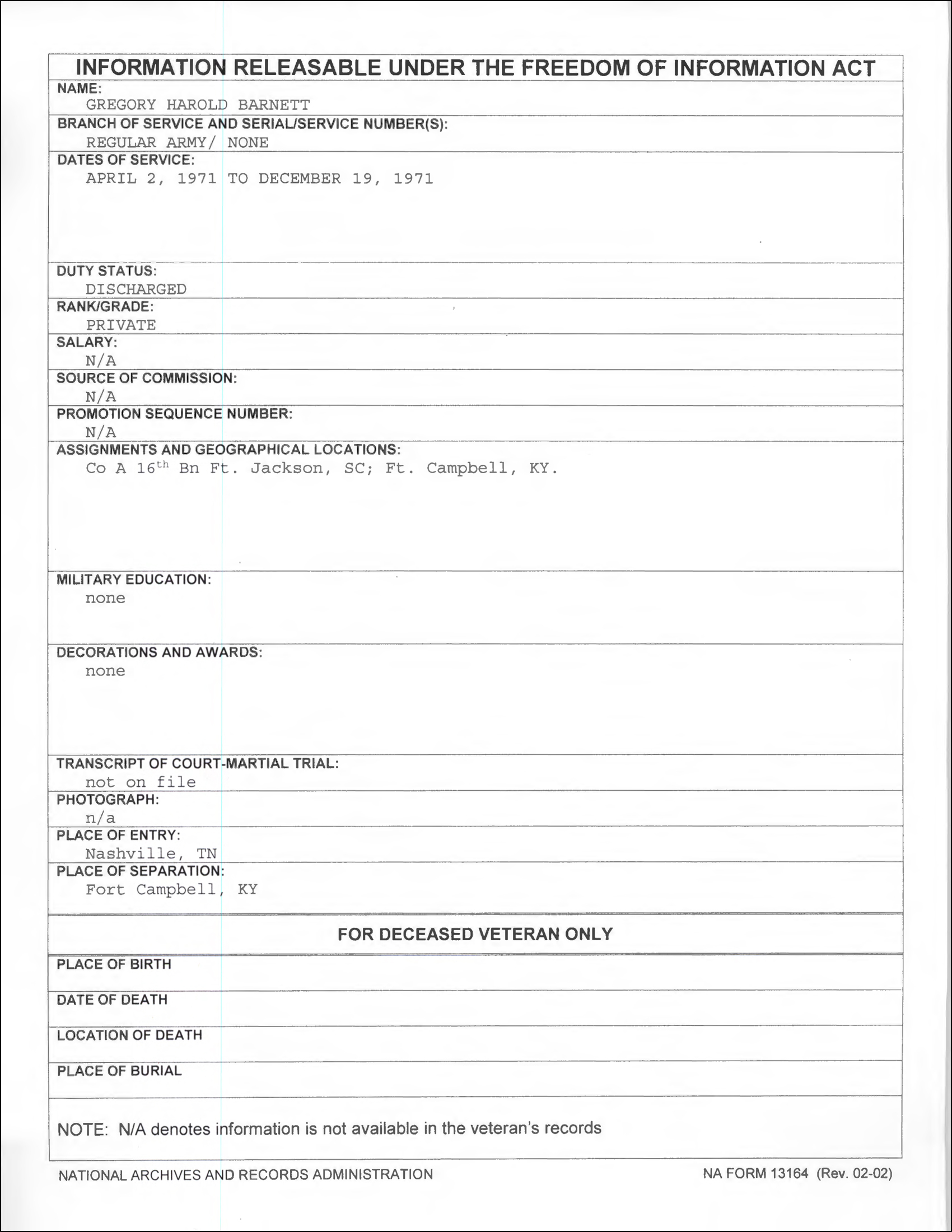 Barnett’s military records show a short enlistment of eight (8) months and getting out as a Private. A early discharge at a lower rank usually indicates a problem. Although it is possible that someone completed all early training, was shipped out to a war zone, was wounded and then discharged there is usually a considerable amount of time spent in the hospital and/or rehabilitation.