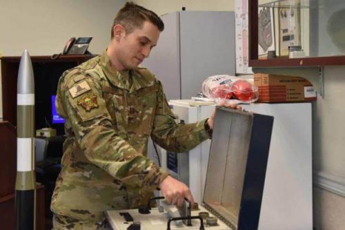 U.S. Strategic Command on Saturday tweeted a news release promoting nuclear launch security measures, along with a photo of Capt. Alexander Garland, a 341st Operations Support Squadron nuclear cryptographic operator, inserting a floppy disk into equipment at the base, according to the photo caption. He was wearing the patch on his Operation Camouflage Pattern, or OCP, uniform in the photo.