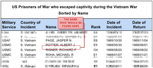 So Rick goes on to tell a story about him being a POW in Vietnam, escaping and wandering around in Cambodia for 22 days. He also says he was awarded “several” which implies at least two (2) Purple Hearts during his service.
