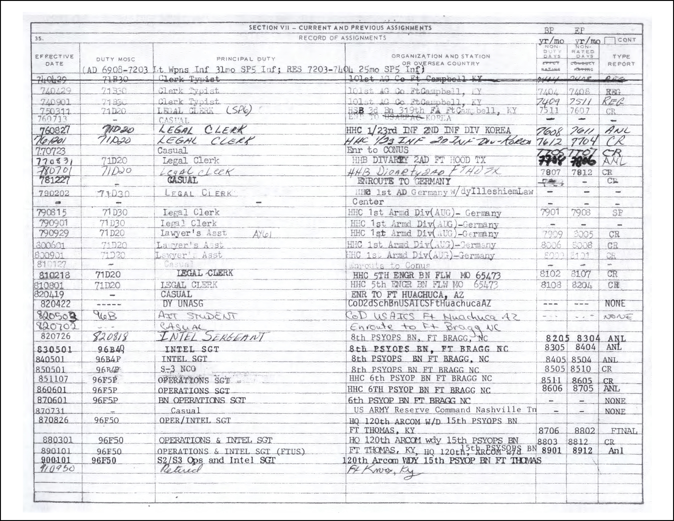 Why is his information from his original Active Duty time not listed except as summary above first line 6908-7203 Infantry SP5. My guess is this was when he was in Vietnam and earned his CIB, Purple Heart, Bronze Star, two Air Medals, and Three ARCOMs with V device (i.e 2OLC).