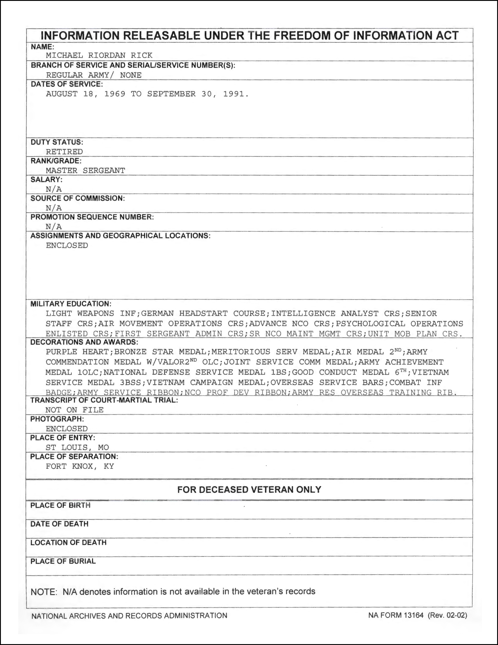 The folks at MilitaryPhony send us their work on Michael Riordan Rick. In turn, this case was brought to their attention by a special ninja that is part of the TAH community, so what goes around comes around. Mike Rick, or the guy with two first names, comes to us from Fort Wayne Indiana. He is 70 years old as this article goes to print – June 2021.