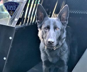 The next morning, Trooper Dan Purtell and his K-9 partner Binks responded to help Tewksbury police after one of the town’s K-9 officers conducted a traffic stop where the vehicle backed into the police cruiser and fled the scene.