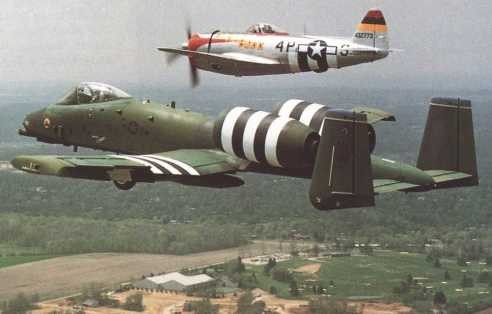 A close second for awesome paint jobs on the A-10 is the D-Day-style invasion stripes. Here’s a pic of a Thunderbolt II with a P-47 Thunderbolt, body wearing the invasion livery. I guess one good thing about being the ugly duckling of the Air Force is nobody cares much about how you paint them.