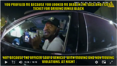 “I know. But what I’m saying is, what you’re doing is wrong, to Black men,” he says. “And you need to stop that. Thank you so much, but this ticket means nothing to me … What I’m saying to you is stop racially profiling Black men in their cars sir. Stop doing that.”