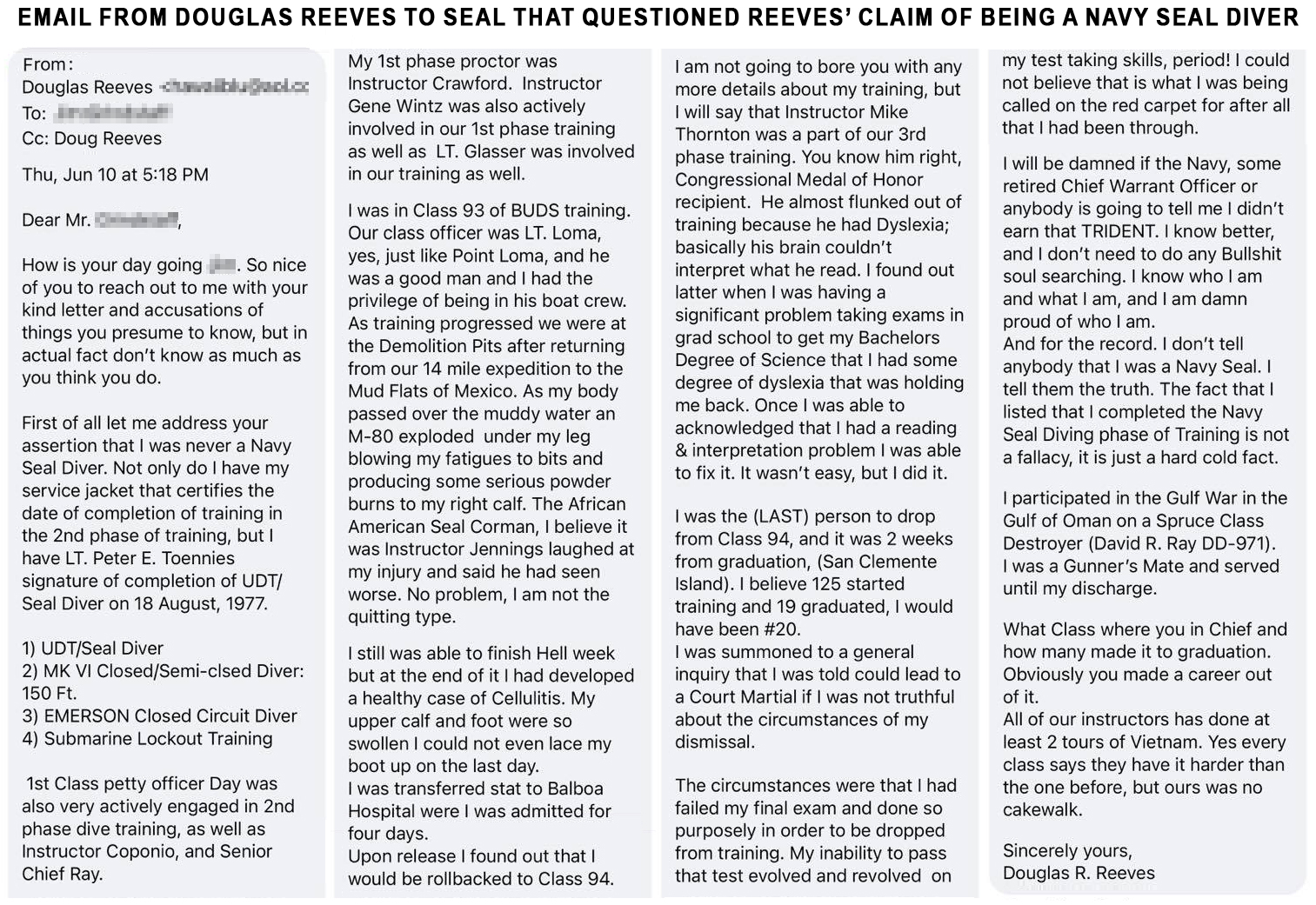 As a follow-up to a posted article yesterday about Douglas Reeves, we wanted to share an email that Reeves wrote to a genuine Navy SEAL when that SEAL questioned Reeves’ claim of being a Navy SEAL diver.