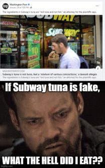 Apparently, someone tested the tuna and found the DNA has no trace back to actual tuna. Subway claims that the test is flawed and cannot produce reliable results with denatured (i.e. cooked) tuna. This opened up a wider debate and research into the “tuna chain” which suggested that if it is in fact true that the tuna is fake, it may not be Subway’s fault.