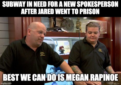 Oh wait… pump the brakes softly. This all has had a natural transition to Megan Rapinoe, the female soccer player that is the face of Subway nowadays.