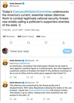 “This dilemma was unresolved by the Russia probe and 2 impeachments. With many Republicans denying the reality of the Jan. 6 attack, I doubt the #January6thCommittee will resolve it either. That leaves it up to the voters, making even more essential free, fair, access to the polls.” – Katie Benner