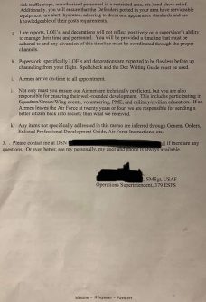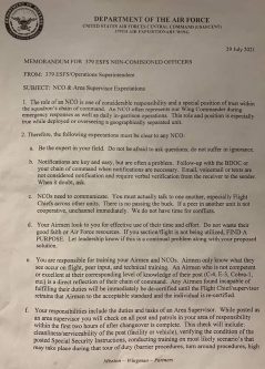 “Airmen only know what they see occur on flight, peer input, and technical training,” the senior master sergeant wrote. “An Airmen [sic] who is not competent or excellent at their corresponding level of knowledge of their post … is a direct reflection of their chain of command.”