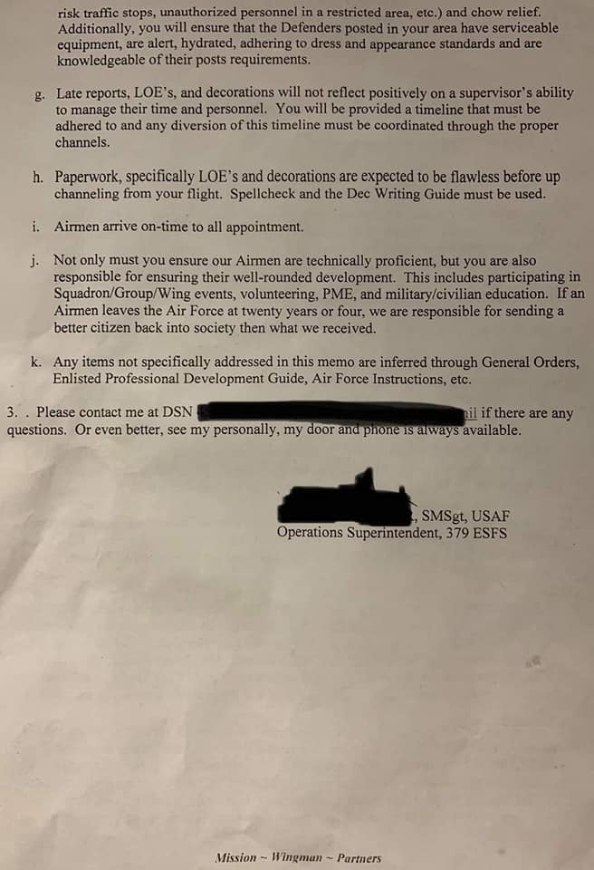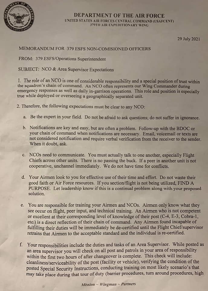 When someone asks, “What’s the military like?”, you can now point to this memo. What you see above is from a senior master sergeant (E-8) in the US Air Force. He/she is the Operations Superintendent for the 379th Expeditionary Security Forces Squadron. They’re at some deployed location and the Senior here decided to clear the air and direct his NCOs on how he’d like things run. No problem, right? Well, some of the things they demand they violate in their own memo.