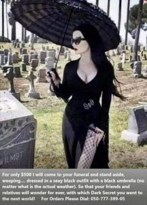 HA!!! President Sniffy with the taliban really got me! But the hot babe in black at my funeral would be a nice contrast to my bestie (who has already agreed to be at my funeral wearing a cloak and carrying a scythe…)