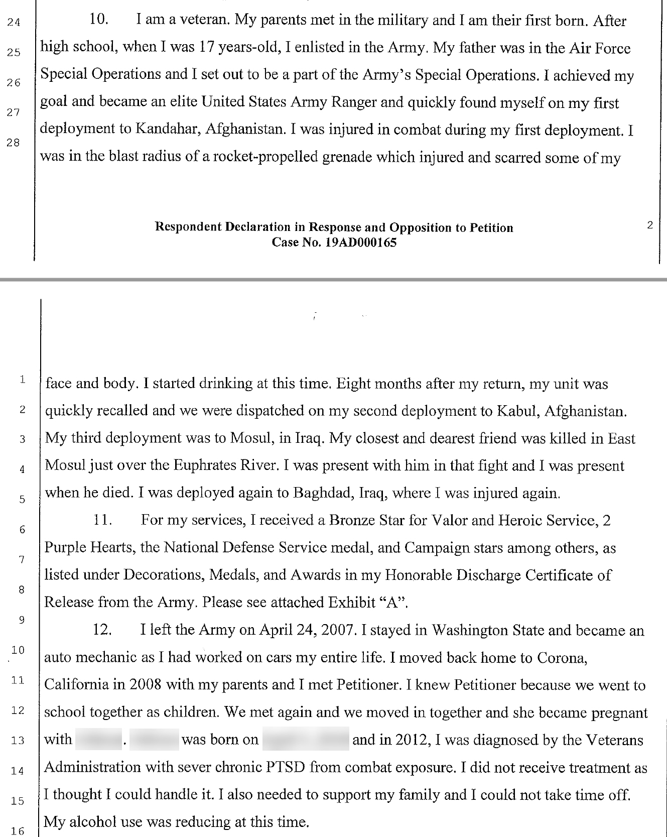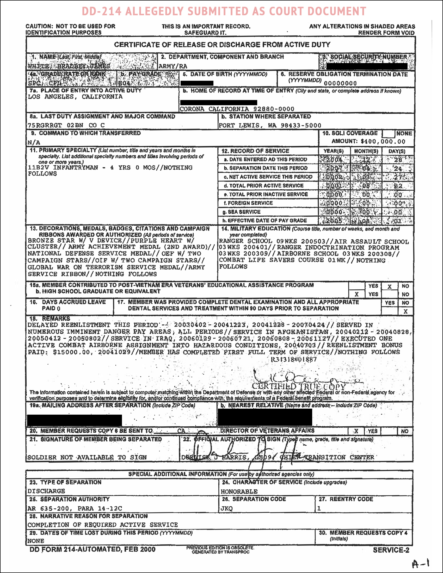 These claims are reinforced and expanded upon when he allegedly submitted court documents that included a DD-214 claiming 75th Ranger Regiment, a Bronze Star with “V” and two Purple Hearts. This DD-214 also annotated service in Afghanistan and Iraq. Military Phony obtained these documents via a third party so cannot speak to their authenticity, but we are told they are part of the court’s record.