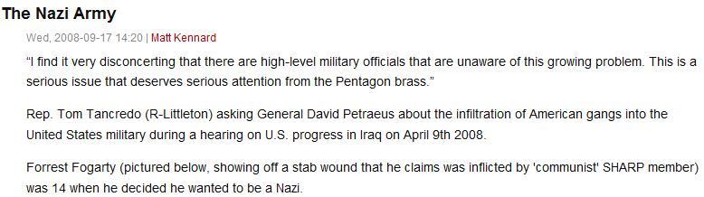 The other night I mentioned Salon’s Matt Kennard and his hastily assembled Neo-Nazis are in the Army now in relation to Geof Millard, IVAW’s self-styled racism expert. Oh, did I say hastily assembled? Actually it was merely an edited version of the same article Kennard wrote last summer. It didn’t get much attention then, but I remember reading it.