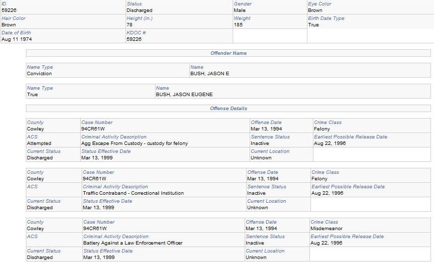 I did, however, find a 34-year-old Jason Eugene Bush, but not in military records. I wonder if he’d made time for his special operations training while he was in prison in Utah for trafficking contraband, trying to escape from custody, and assaulting LEOs;