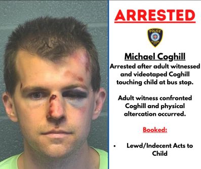The victim’s father sat in his car waiting to see if Coghill would make an appearance and touch the child inappropriately. As the boy made his way to the stop, Coghill stopped his jog and approached the boy, according to the police report.
