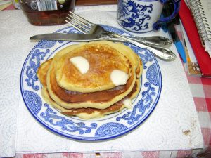This is an old-timey favorite, and occasionally, my dad used to fix it. I loved it, because the griddle cakes had a crispy edge to them and really soaked up the butter and maple syrup – but that’s just me. I was a kid. Kids are always hungry. Fix some good sausages to go with these bad boys, and I’m back in the kitchen with the snow outside flying and the wind howling around the chimney.