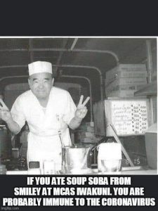 To whoever made the meme about the soba truck at Iwakuni, you brought back a flood of memories! I don’t know when that photo was taken but, I swear that’s the same “Smiley” I bought soup from (extra pork) in the mid eighties! I was assigned to H&MS 15 so I saw him every day.