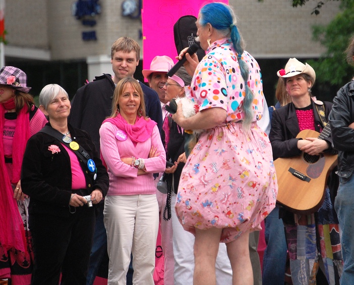 Yes, that’s Patch Adams in the photo – and that’s his preferred color for his hair all of the time, not just for last year’s Code Pink Mothers’ Day event in DuPont Circle where I took that picture.