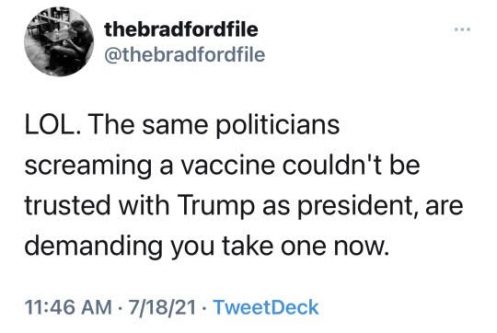 We have a society of self absorbed sheep minded adolescents that are being programmed to not trust the vaccines by their peers on Facebook, blogs like this, or the ridiculous grifter talking heads in their media sphere so they obediently act outraged that they have to get a vaccine.