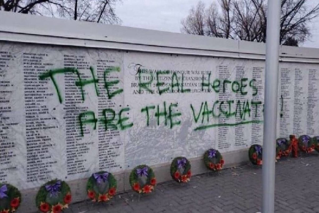 Cranbrook RCMP are investigating after someone spray painted COVID-19 related graffiti on the Wall of Honour at the Cenotaph in Rotary Park on Remembrance Day.