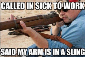– Called in Sick to work-Said my arm was in a sling. Hell! If I tried that, my ass would be in sling!!