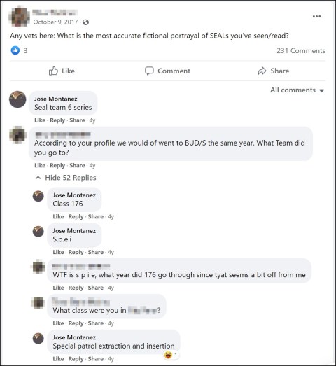 On a Facebook post in another group, Montanez chimes in about the accuracy of a television series depiction of Navy SEALS. He is asked by a real SEAL which BUD/S class he was in to which Montanez promptly replied “Class 176.” Montanez also added the acronym S.p.e.i. [sic] but is it actually S.P.I.E. and stands for “Special Patrol Insertion/Extraction.”