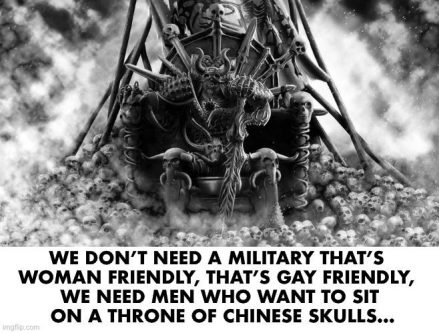 “We don’t need a military that’s woman-friendly. We don’t need a military that’s gay-friendly, with all due respect to the Air Force. We need a military that’s flat-out hostile. We need a military full of Type-A men who want to sit on a throne of Chinese skulls, but we don’t have that now. We can’t even get women off of naval vessels,” he said. “That should be step one, but most of them are already pregnant anyway.”