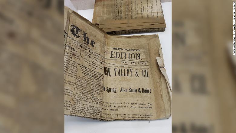 Items inside included an 1865 edition of Harper’s Weekly magazine with an clear image of a figure weeping over Abraham Lincoln’s grave; a Bible with a coin stuck to it; and a Richmond directory.