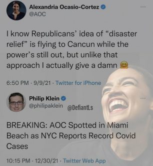 Representative Alexandria Ocasio-Cortez was caught in Florida, without a mask, enjoying herself. Last year, she was one of those who criticized Senator Cruz for leaving Texas during a deep-freeze related power outage. New York City is seeing rising cases of COVID-19.