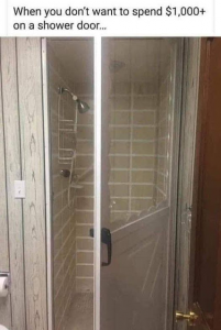 In further proof that one can be a redneck north of the Mason-Dixon line, I’m looking at that shower door as a great design idea for a cabin in the woods. Do the interior of the shower in cedar and corrugated tin paneling, retro piping and fixtures…