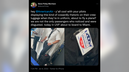 It turns out that some lady saw an American Airline’s pilot’s luggage with the sticker “Let’s Go, Brandon” and she complained to American Airlines on Twitter.