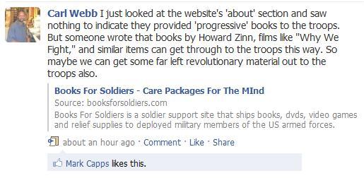 And oh, yeah, if you’re wondering what their mutual friend Carl Webb is up to these days – he’s trying to get his friends to send “far left revolutionary” books to the troops in theater;