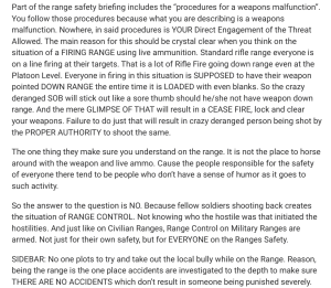 What if someone starts shooting for real at the range? Apparently you’re supposed to lay there and take it, because that wasn’t covered in the safety brief. I don’t know why he conflates intentional, felonious assault with a weapons malfunction. There is an obviously and readily apparent difference between the two. Even a Braxton Anderson III should see it.