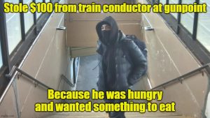 First of all, he used a firearm in his struggle to get “something to eat” and put the life of an innocent civilian in mortal jeopardy. If the conductor would have tried to stop him, I sincerely doubt that the dumbass wouldn’t have pulled the trigger several times and taken away everything that man ever had or ever would have.