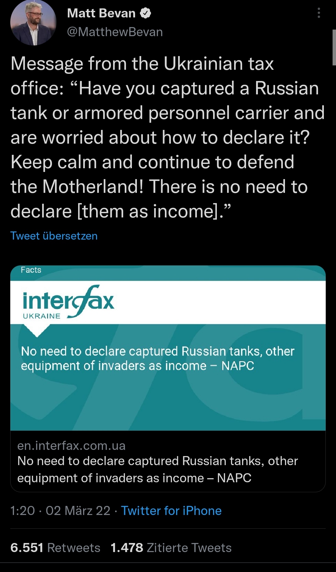 Message from the Ukrainian tax office: “Have you captured a Russian tank or armored personnel carrier and are worried about how to declare it? Keep calm and continue to defend the Motherland! There is no need to declare [them as income].”