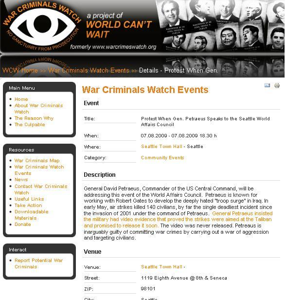 Nucsnipe writes to tell us that General Petraeus is scheduled to speak tonight at the World Affairs Council in Seattle. Of course, the moonbats of World Can’t Wait spot an opportunity to do some fund raising;