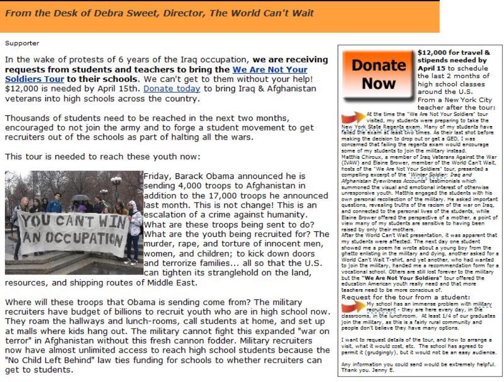 One of the refugees from IVAW sent me a fund raising letter he got from World Can’t Wait (the organization founded by a lifelong communist) a few months ago. They were trying to solicit $12,000 to send Matthis Chiroux around the country to interdict recruiters’ influence in schools. Here’s the main part of the letter;